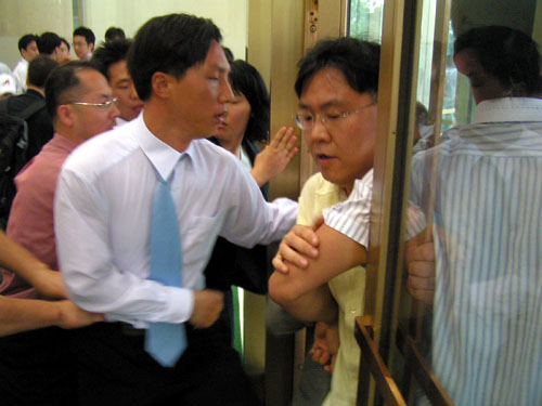 ▲ 용역의 틈을 비집고 한 간부가 건물에 진입하고 있다. |