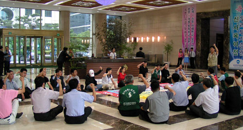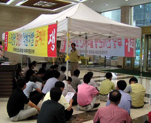 우리투자증권지부와 연대 단위들과 30분 여의 몸싸움 끝에 5일 오후 1시 20분 경 로비에 다시 천막을 설치했다.