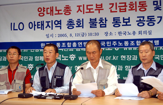 양대노총 지도부는 기자회견 자리에서 고 김태환 충주지부장 사망, 보건의료노조 직권중재, 파행적 최저임금 결정, 아시아나조종사노조 긴급조정 등을 열거하며 "현정권은 노동탄압적이고 노동배제적인 정책으로 일관하고 있다"고 비난하고 총회 불참 입장을 밝혔다.
