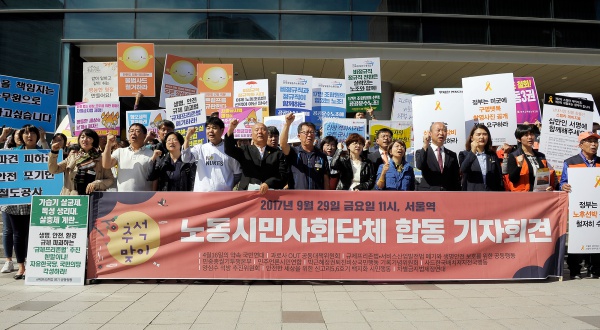 민중총궐기투쟁본부, 민주노총 등 11개 단체는 29일 오전 서울역 앞에서 ‘추석맞이 노동시민사회단체 합동 기자회견’을 열고 각 분야의 적폐 과제들을 하나하나 짚었다.