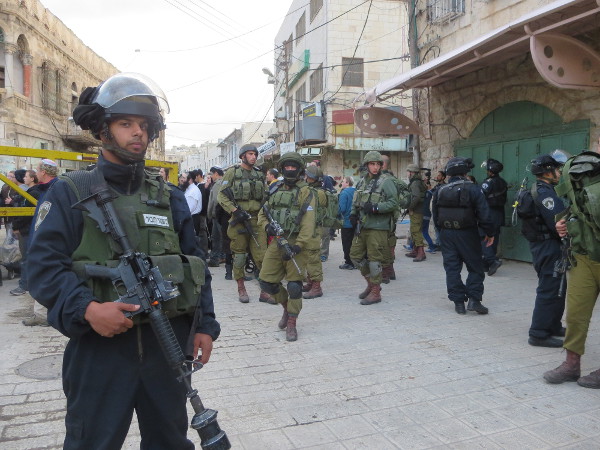 ▲ 서안지구 헤브론에서 매주 토요일 열리는 유대인들의 '정착민 여행'을 군인들이 호위하고 있다. [출처: 뎡야핑] |