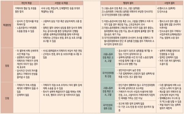 총 111p에 달하는 성폭력 대응 매뉴얼은 일터 내 성폭력 사건이 발생했을 때 당사자와 조력자가 어떻게 준비하고 대응해야 하는지 다양한 해결 방법을 제공한다. 개인적 해결, 사업장 내 해결, 행정적 해결, 사법적 해결 등 피해자가 맞닥뜨릴 수 있는 여러 상황에 대한 대처를 순서와 함께 구체적으로 제시했다. 노동조합 내 성폭력 사건 대응 방법도 제시돼 있다.