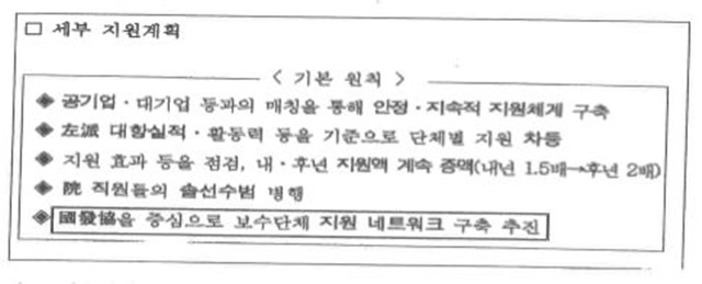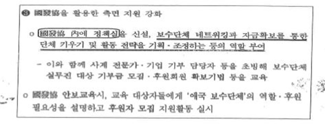 이와 함께 국정원은 보수단체 지원 네트워크 구축사업을 전개했다. 그리고 보수단체 지원·육성과 외연 확장 사업의 중심에는 국정원이 만든 ‘국가발전협의회(국발협)’가 있었다.