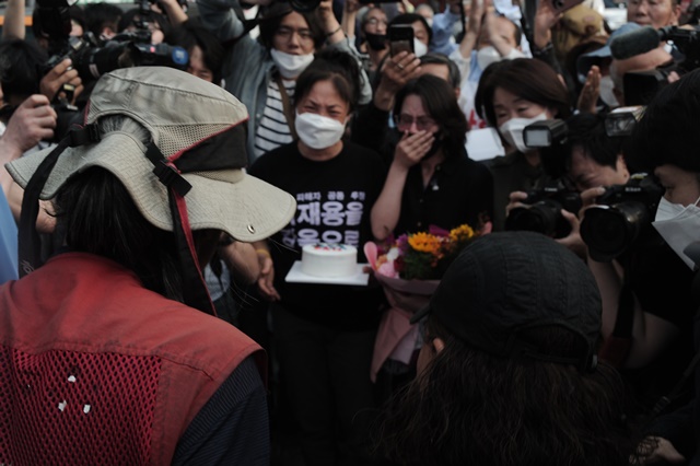 김용희 씨는 119 사다리차를 통해 땅을 밟은 후, 깃대를 지팡이 삼아 집회 장소로 이동했다. 삼성공대위, 보암모 등 연대 단위는 김용희 씨를 반기며 포옹했다. 김용희 씨는 지상 첫 발언을 통해 “처절한 고통 속에 신음하며 사법부·행정부·입법부를 다녔다. 아무도 저를 봐주시지 않았고 등을 돌렸다. 그래서 마지막으로 선택한 것이 목숨을 내던져서라도 사회에 해고노동자들의 삶이 비참하게 뭉그러지는 고통을 조금이라도 알리고 싶었다. 철탑에 오르기 일주일 전 눈으로 저 철탑을 찍어놓고 잠을 못 잤다. 과연 내가 삼성과 맞서 싸울 수 있을까 차라리 죽어서 내려오자. 저의 가정은 정말 말로 담을 수 없을 만큼 고통을 겪어왔다. 해고는 살인”이라고 말했다.