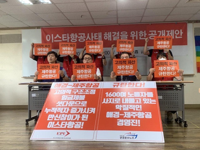 공공운수노조는 14일 오전 11시 민주노총 대회의실에서 기자회견을 열고 “만일 제주항공 경영진이 이 모든 희생을 무시한 채 이스타항공을 파국으로 이끈다면, 그 모든 책임을 지게 될 것”이라고 밝혔다. 이어 노조는 “250억의 임금체불과 1600명 이스타항공 노동자들을 길거리로 내몬 책임, 시장독점을 위해 이스타항공을 의도적으로 파산시킨 책임을 물을 것”이라며 “온갖 특혜를 얻고도 사회적 책임은 일절 외면한 책임을 지게 될 것”이라고 말했다. 앞서 제주항공은 오는 15일까지 이스타항공에 800억 원가량의 부채를 해결하지 않을 시 인수계약이 파기될 수 있다는 ‘최후통첩’을 한 바 있다.