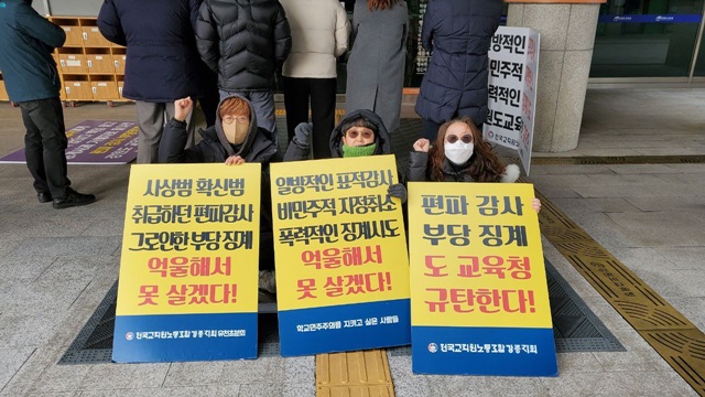 강원도교육청노조는 이즈음 성명을 통해 지방공무원이 혁신학교 교사들의 괴롭힘으로 학교를 떠났다는 성명을 냈다. 그러나 이는 강릉교육장(강릉교육지원청장)을 통해 사실이 아님이 밝혀졌다. 전교조 강릉지회는 당사자가 학교 회계직이 맞지 않아 더 좋은 직장으로 떠나겠다는 의사를 밝혔으며 비공식적 사유도 없다는 점을 확인했다. 그러나 혁신학교 내에서 전교조 교사들의 횡포로 행정실공무원들이 괴롭힘 당하고 있다는 소위 ‘갑질’ 논란은 기정사실화돼 지역의 보수적 여론에 불을 지폈다. 이 과정에서 비정규직인 ‘교무행정사’의 위치와 6-7급 공무원인 행정주무관의 용어가 혼동돼, 교사들이 교육공무직에 갑질을 했다고 오해받는 일도 있었다.