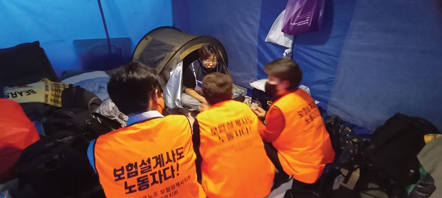 ▲ 연대온 한화생명 보험설계사 노동자들과 이야기 나누고 있는 단식농성 40일차 임종린 지회장 [출처: 연정] |