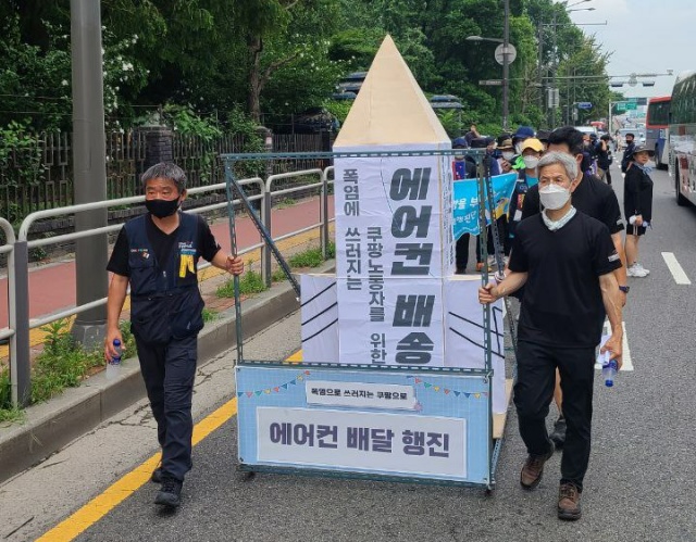 23일 공공운수노조 전국물류센터지부 쿠팡물류센터지회는 서울 잠실 쿠팡 본사 앞에서 기자회견을 열고 “노동조합은 더 이상의 노동자가 쓰러지지 않도록, 하루를 일해도 건강히 일할 수 있는 일터를 만들기 위해 시민사회와 함께 직접 에어컨을 설치하기로 결의했다”라며 “잠실 본사에서 쿠팡동탄센터까지의 도보 행진을 통해 쿠팡 물류센터 내 폭염 실태를 알리고 올해에는 더 이상의 노동자가 쓰러지지 않도록 현실적인 폭염 대책 마련이 필요함을 곳곳에 알릴 것”이라고 밝혔다.