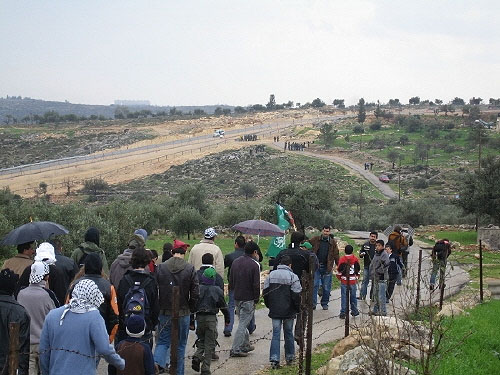 ▲ 장벽 건설 현장으로 행진을 하고 있는 사람들. 저 멀리 장벽 공사 현장과 이스라엘 군인들이 보입니다. |